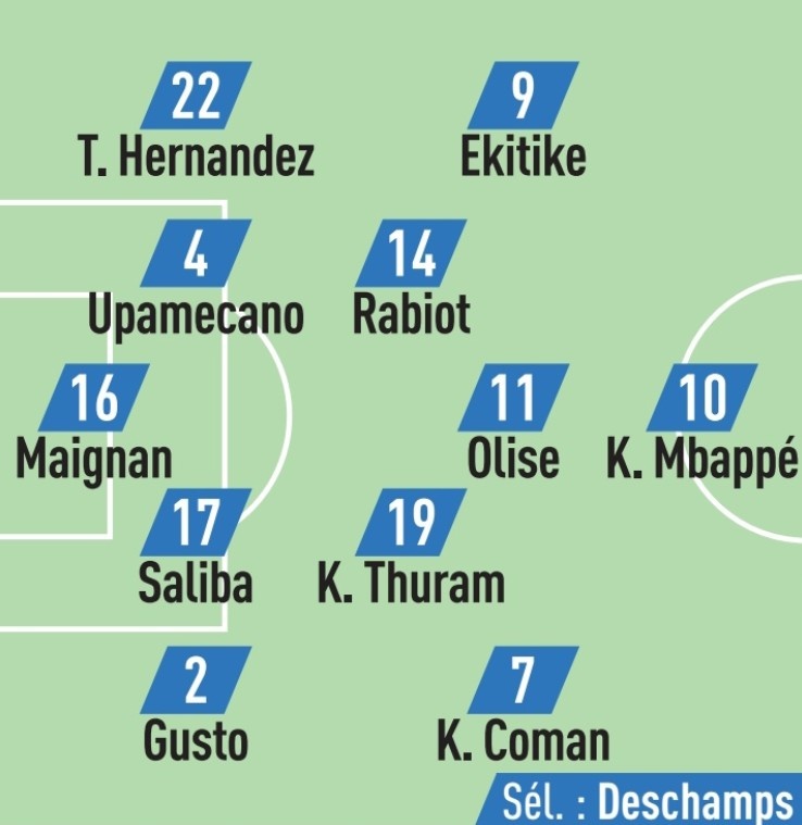队报算计法国队首发:迈尼昂;特奥、于帕梅卡诺、萨利巴、古斯托;拉比奥特、K-图拉姆、埃基蒂克、奥利塞、科曼;姆巴佩