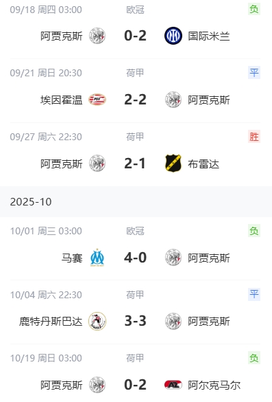 本赛季阿贾克斯欧冠3场全败,丢了11个球,只打进了1个点球。在36支球队中唯有本菲卡雷同3连败,但本菲卡在净胜球上大幅跨越阿贾克斯。