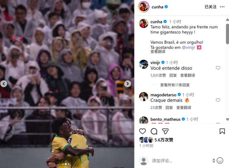 赛后库尼亚也在社媒晒出与维尼修斯庆祝进球的合照,配文写说念:“咱们特殊风景能与这支伟大的球队不时前进,加油巴西队,咱们为你傲气。与维尼修斯连线破门!”