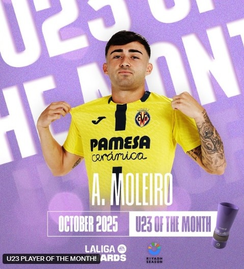 10月30日讯 西甲官方晓谕,比利亚雷亚尔中场阿尔维托-莫莱罗(Alberto Moleiro)当选10月最好U23球员。