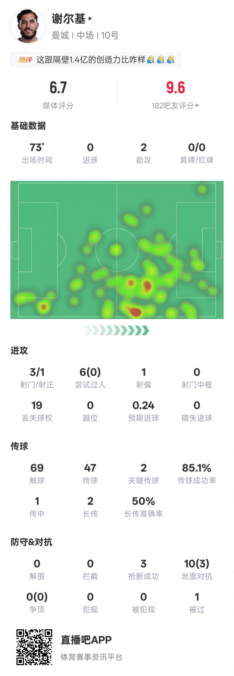 11月3日讯 2025-26赛季英超第10轮,曼城主场迎战伯恩茅斯。谢尔基首发出战,送出2次助攻,2次要津传球,还有3次抢断,评分6.7。