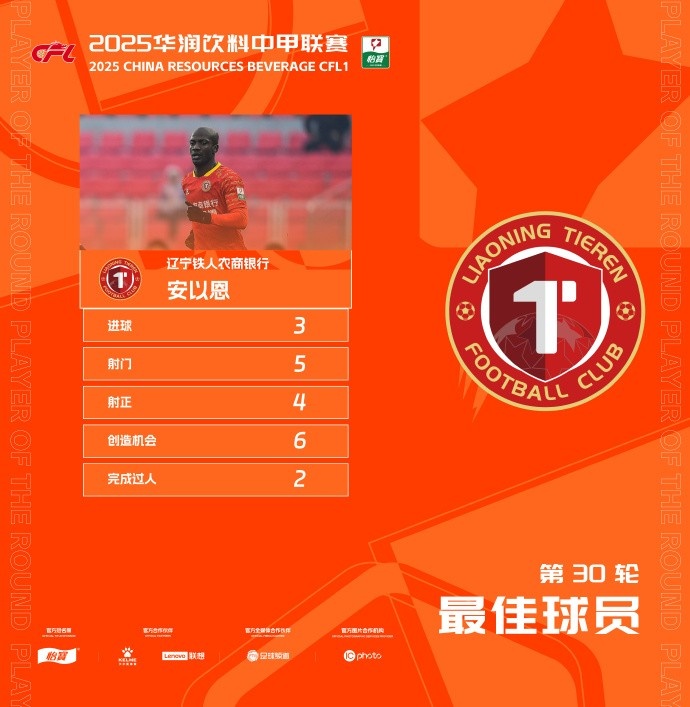 11月12日讯 演出帽子戏法的辽宁铁东说念主球员安以恩,当选为中甲联赛第30轮最好球员。