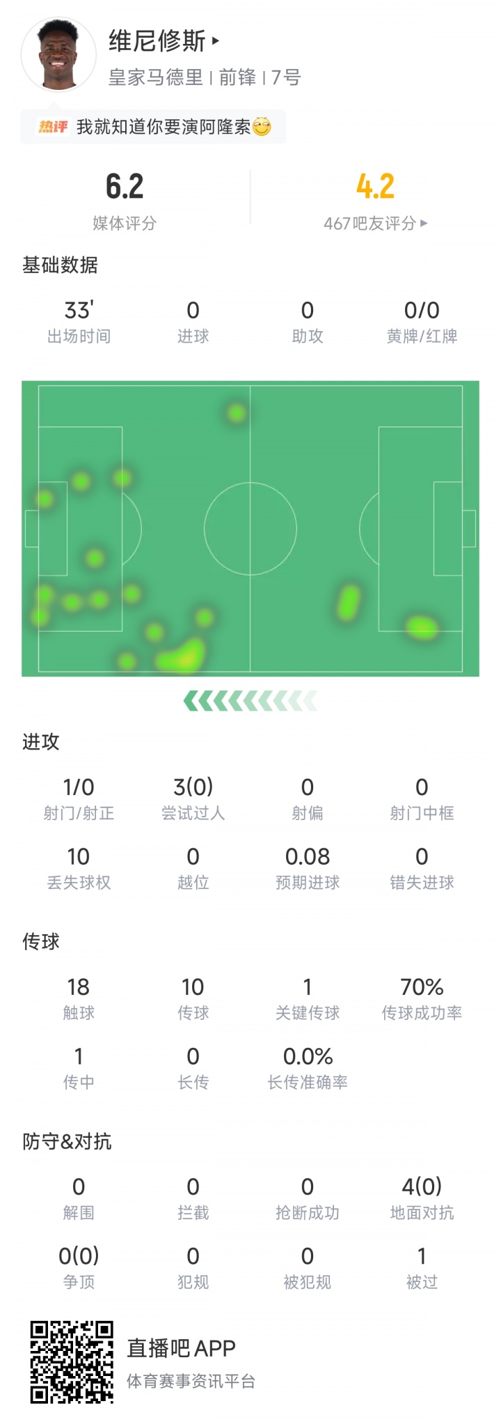 维尼修斯这场比赛发达欠安,3次过东说念主0到手,4次叛逆0到手,18次触球丢了10次球权,赛后评分独一6.2分。