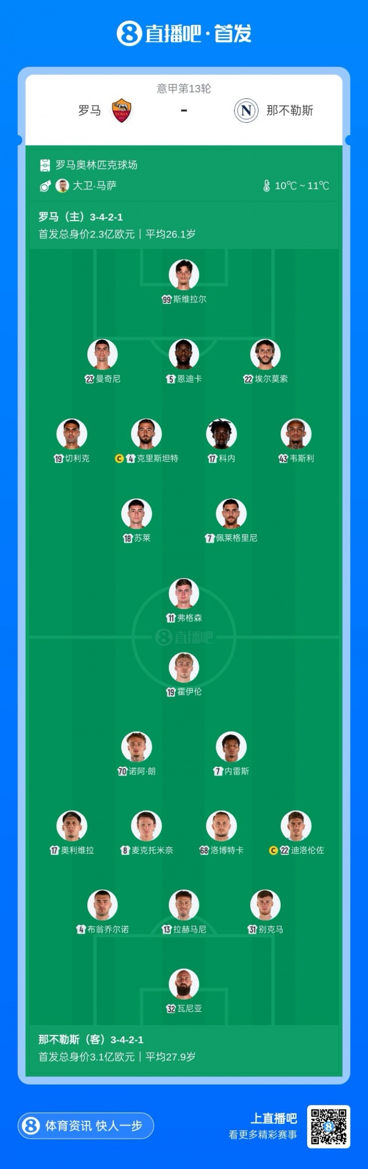 12月1日讯 意甲第13轮,罗马对阵那不勒斯,赛前首发公布。