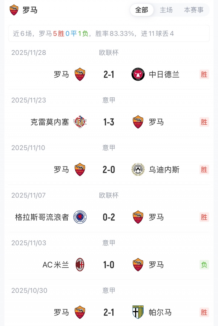 罗马首发:99-斯维拉尔、23-曼奇尼、5-恩迪卡、19-切利克、22-埃尔莫索、4-克里斯坦特、17-科内、43-韦斯利、18-苏莱、7-佩莱格里尼、11-埃文·弗格森