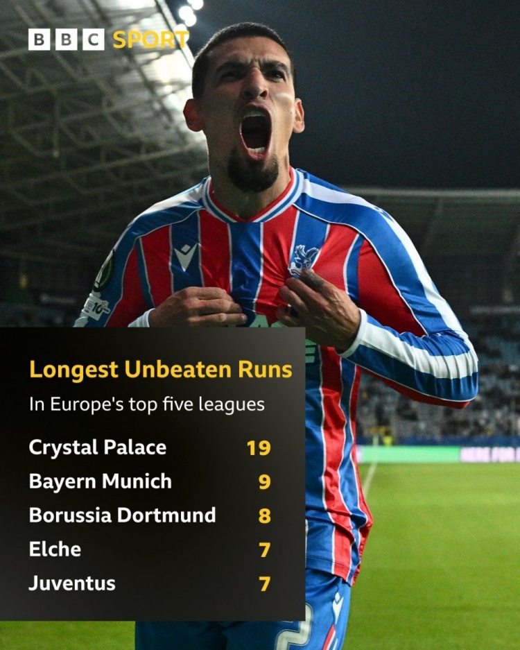 10月3日讯 BBC统计了现在五大联赛球队的不败场次,并排出榜单,水晶宫19场居首,拜仁9场次席。