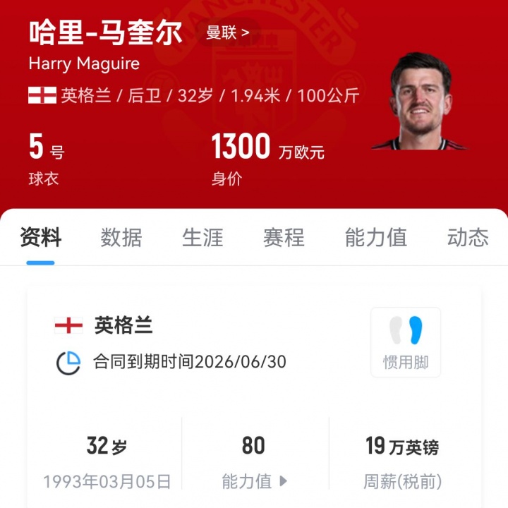 32岁的马奎尔2019年从莱斯特城以8700万欧元的价钱加盟曼联,于今已为球队效用6年。他与曼联的现存条约将于来岁夏天到期,当今的身价为1300万欧元。