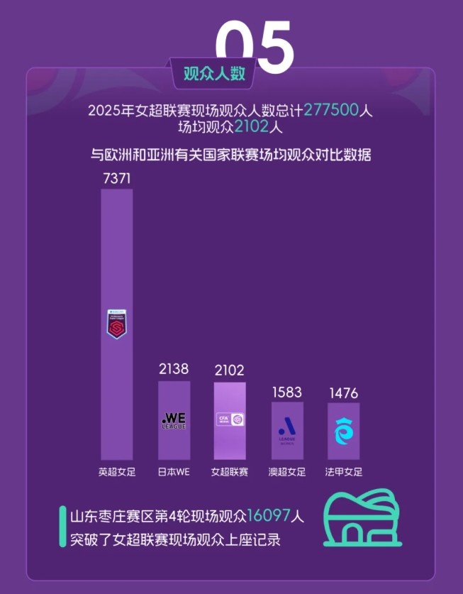 2025年女超联赛现场不雅世东谈主数策画277500东谈主,场均不雅众2102东谈主,在亚洲鸿沟仅次于日本WE联赛。