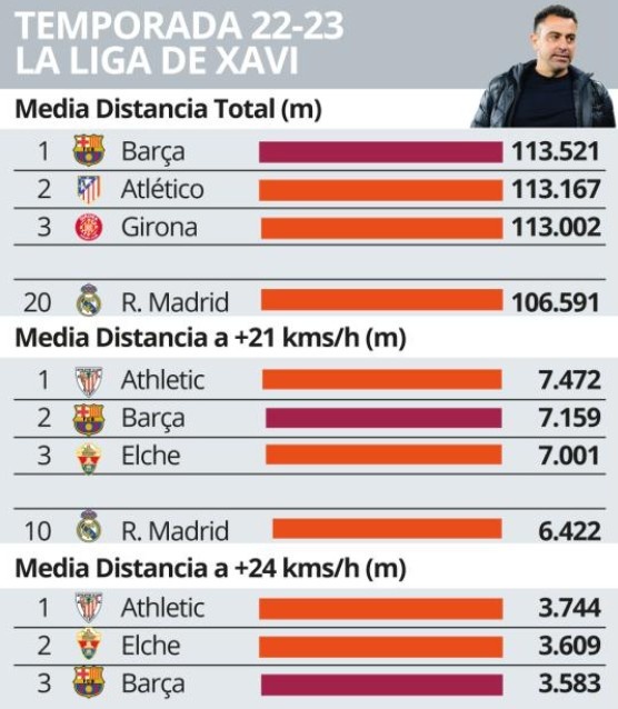 比拟之下,那两年皇马的跑动距离远少于巴萨。因此,哈维和弗里克带队夺冠时的数据格外雷同。问题在于,在本赛季的前八轮比赛中,有十四支西甲球队的跑动距离跳跃了巴萨。