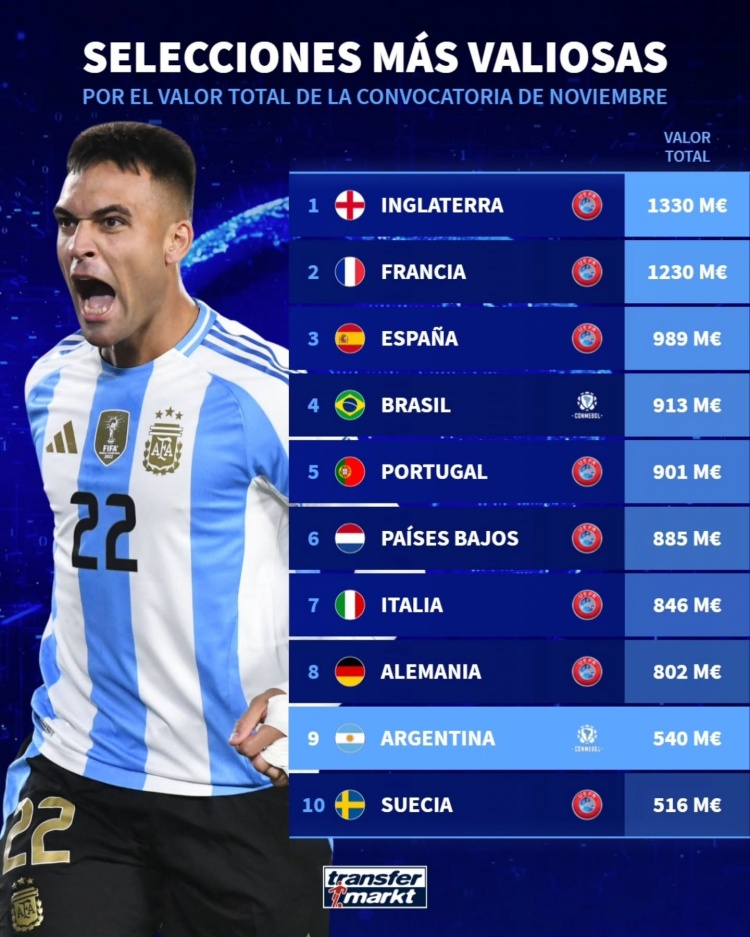 11月15日讯 德国转会市集统计了11月海外比赛日列国度队的身价,并排出榜单,英格兰、法国、西班牙前三,阿根廷排在第九位。