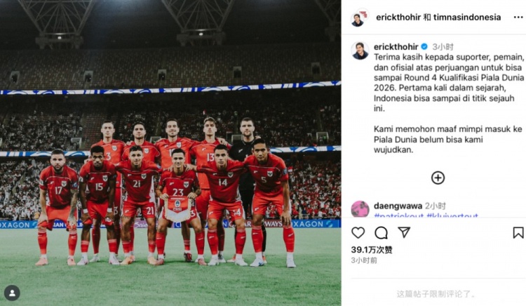 赛后印尼足协主席托希尔在社媒谈到了印尼队的发扬,他写说念: