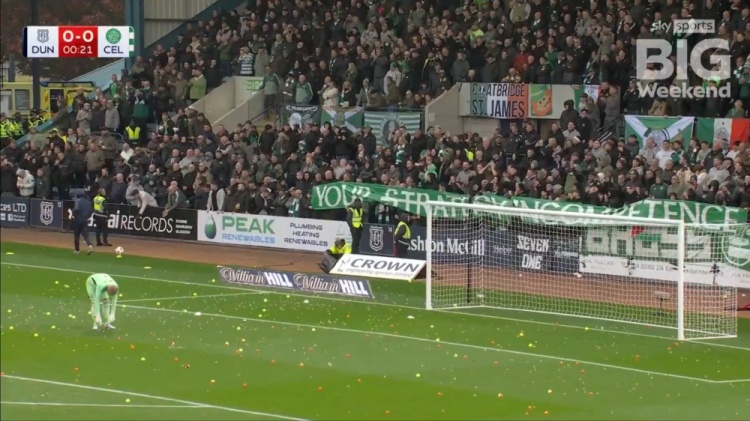 10月20日讯 《太阳报》报说念,凯尔特东说念主球迷对其俱乐部董事会的抗议动作在本周客场对阵邓迪FC的比赛中再次升级,并导致比赛在开球后不久便中断了三分钟。震怒的凯尔特东说念主球迷向场内投掷了大批网球、微型弹力球以致橘子,一度铺满了本方迫切地点的禁区。