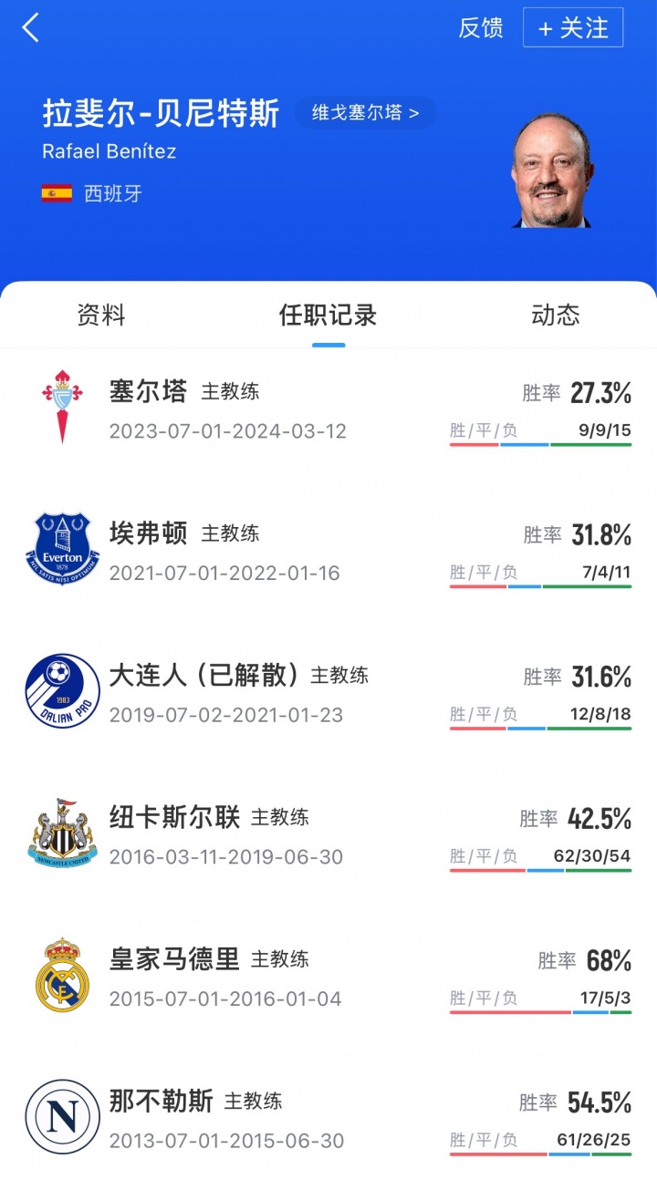 贝尼特斯现年65岁,在旧年3月份离开塞尔塔帅位后失业于今。贝尼特斯此前曾抓教过利物浦、国米、切尔西、那不勒斯和皇马等朱门,荣誉等身,包括2次西甲冠军、1次欧冠冠军、2次欧联杯冠军和1次世俱杯冠军等。此外贝尼特斯还曾在2019年至2021年担任大连东说念主教悔。