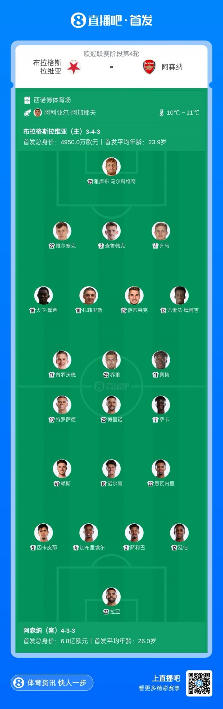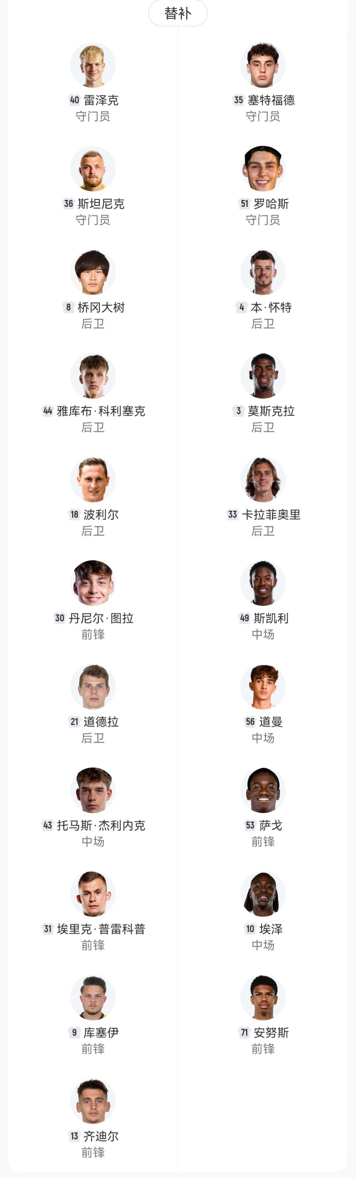 阿森纳现在正碰到伤病潮,一线队锋线6东谈主仅剩特罗萨德、萨卡两东谈主健康,今晚一皆首发;中场梅里诺再度客串中锋,队长厄德高也因伤缺阵;但好音信是防地“八大金刚”现在均健康无虞,为枪手保证了防地的深度。