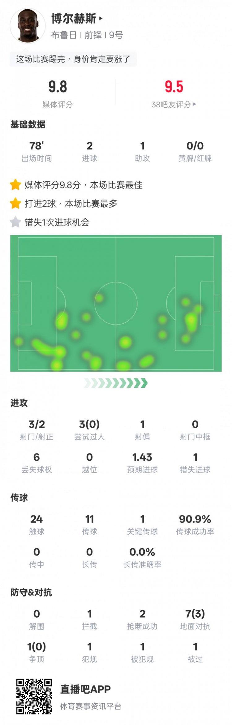 本场比赛,博尔赫斯首发出战,打进2粒进球,送出1次助攻,1次要道传球,传球得胜率90.9%,还有1次羁系和2次抢断。