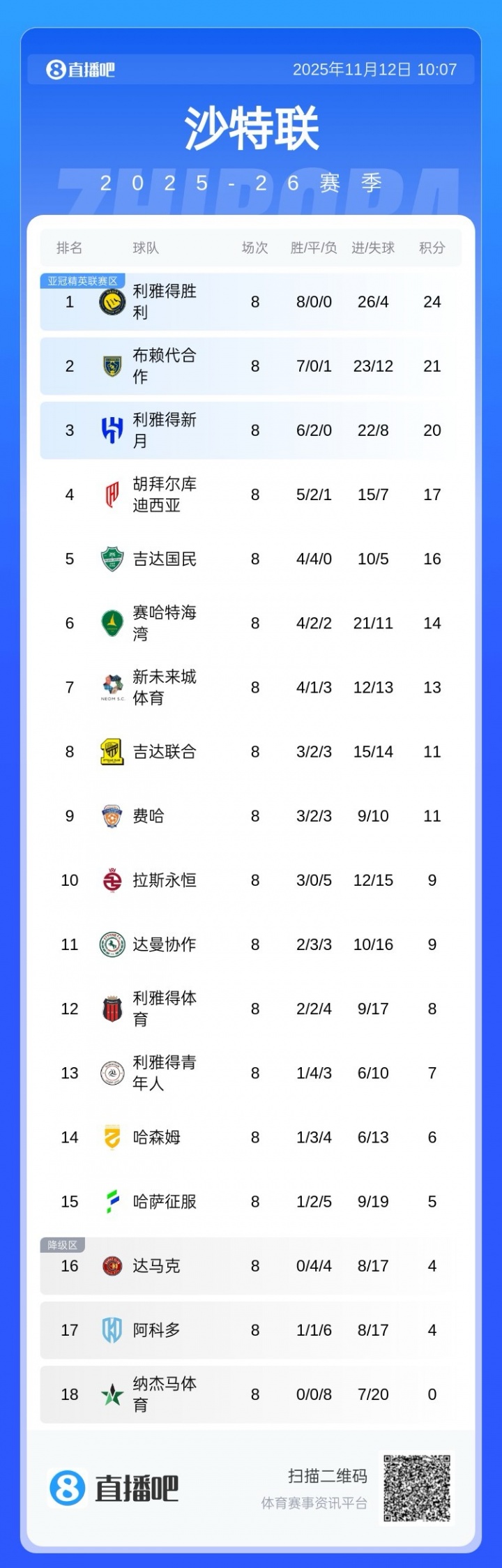 11月12日讯 沙特联第8轮,利雅得收效3-1新翌日城体育。利雅得收效8连胜积24分持续领跑积分榜。