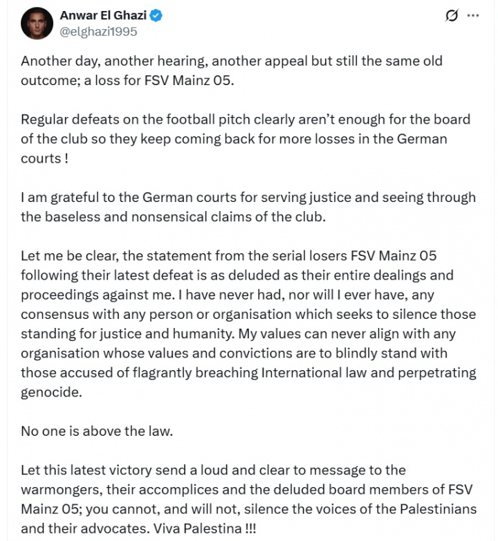 11月13日讯 因撑抓巴勒斯坦而遭好意思因茨不当解约的埃尔加皆当天发布社媒,宣告我方对好意思因茨的讼事再度胜诉。