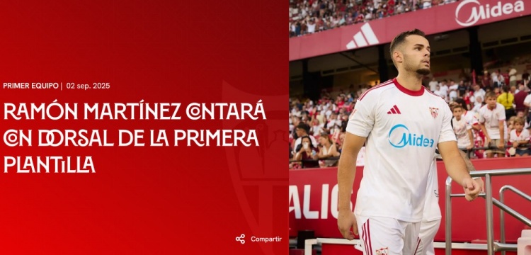 塞维利亚发布公告,说明22岁西班牙中卫马丁内斯本赛季将得回一线队号码,为塞维利亚一线队服从。
