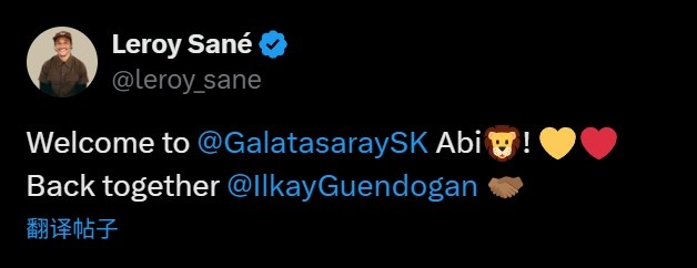 而他的曼城前队友萨内如故迫不足待地通过社媒“提前官宣”:“宽宥来到加拉塔萨雷,咱们又相遇了@京多安!”