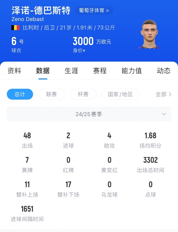 德巴斯特现年21岁,上赛季他为葡体出场48次,孝敬2球4助,现身价3000万欧。